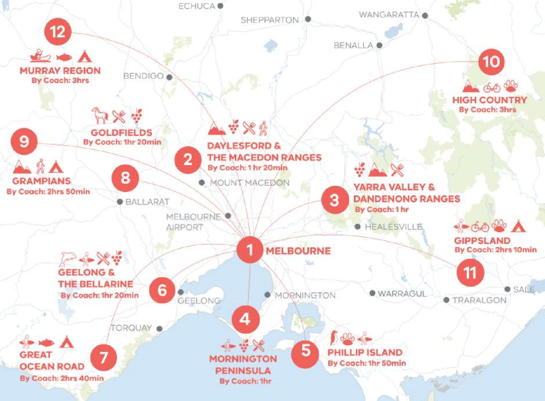 1. 墨尔本 2. 戴尔斯福特和马其顿山脉 3. 亚拉河谷和丹德农山脉 4. 摩宁顿半岛 5. 菲力普岛 6. 吉朗和贝拉里尼半岛 7. 大洋路 8. 巴拉瑞特和金矿区 9. 格兰屏山脉 10. 高山地区 11. 吉普斯兰 12. 莫瑞地区