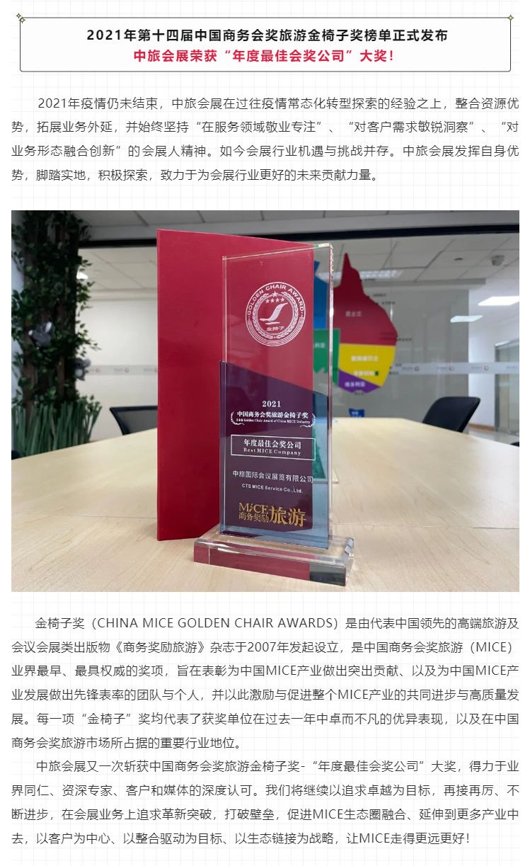 中旅会展获2021年第十四届中国商务会奖旅游金椅子奖 - 年度最佳会奖公司