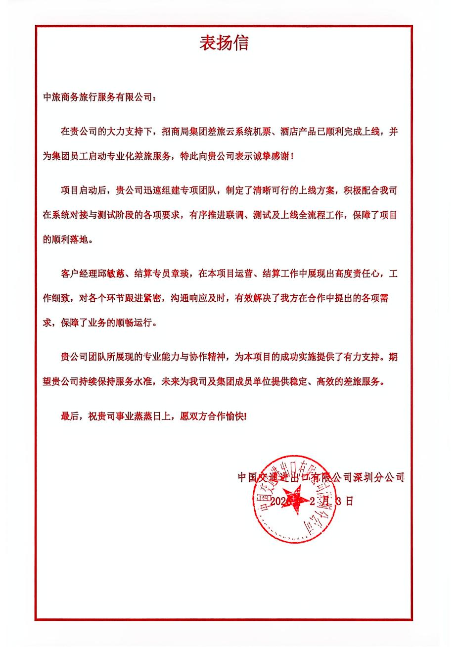 2月3日,中旅商旅收到招商局集团发来的表扬信,这标志着双方自2024年建立合作以来,项目已实现平稳高效运行一周年,并取得阶段性显著成果,对中旅商旅团队在2025年度提供的专业、高效、稳定的全国性商旅服务予以高度肯定。