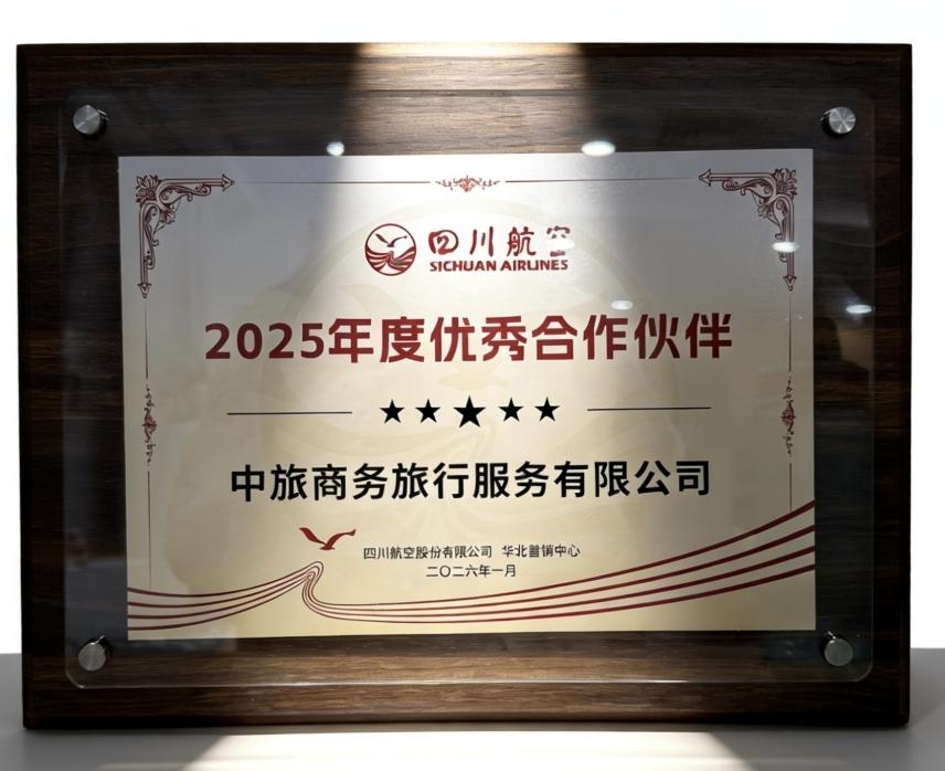 2025年,中旅商旅与四川航空始终秉持“诚信协作、优势互补”的合作理念,在商旅服务领域持续深耕。中旅商旅依托专业的服务团队与高效的运营体系,精准响应市场需求,助力四川航空拓展商务出行业务。四川航空则以稳定可靠的航线网络与优质服务,为中旅商旅的客户提供了坚实的出行保障。双方通过资源联动与服务协同,共同提升了商务出行体验。此项荣誉标志着双方在2025年度的紧密协作取得了丰硕的成果,实现了互利共赢的局面。