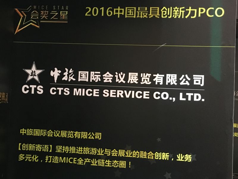 2016年,中旅会展在业务多元化发展上不断有创新之作,引起业界瞩目,如 “北京国际旅游节”、“全球旅游目的地盛典”、“中国博物馆博览会”、“中国互联网+开放合作大会”等品牌项目,获得业界同仁、客户、媒体的高度认可。在2016年“会奖之星”颁奖盛典上,中旅会展因卓越的创新能力荣获最具创新力PCO奖、最具创新力女性领导人奖和会奖创新精英等多个奖项。中旅会展副总经理张士京代表公司领取“2016中国会奖业最具创新力PCO”奖项,中旅会展副总经理张昕丽荣获“2016中国会奖业最具创新力女性领导人”奖项,中旅会展深圳分公司总经理刘静滨、中旅会展整合营销事业部总经理高晓强、汽车能源业务部总经理孙铁燕、资源采购部总经理王晓蕊、市场部负责人叶晓梅荣获“2016中国会奖创新精英”奖项。中旅会展将不懈努力,不断突破,勇于创新,为客户提供更优质的具有中旅特色的服务,为推动会展业发展做出积极的贡献。