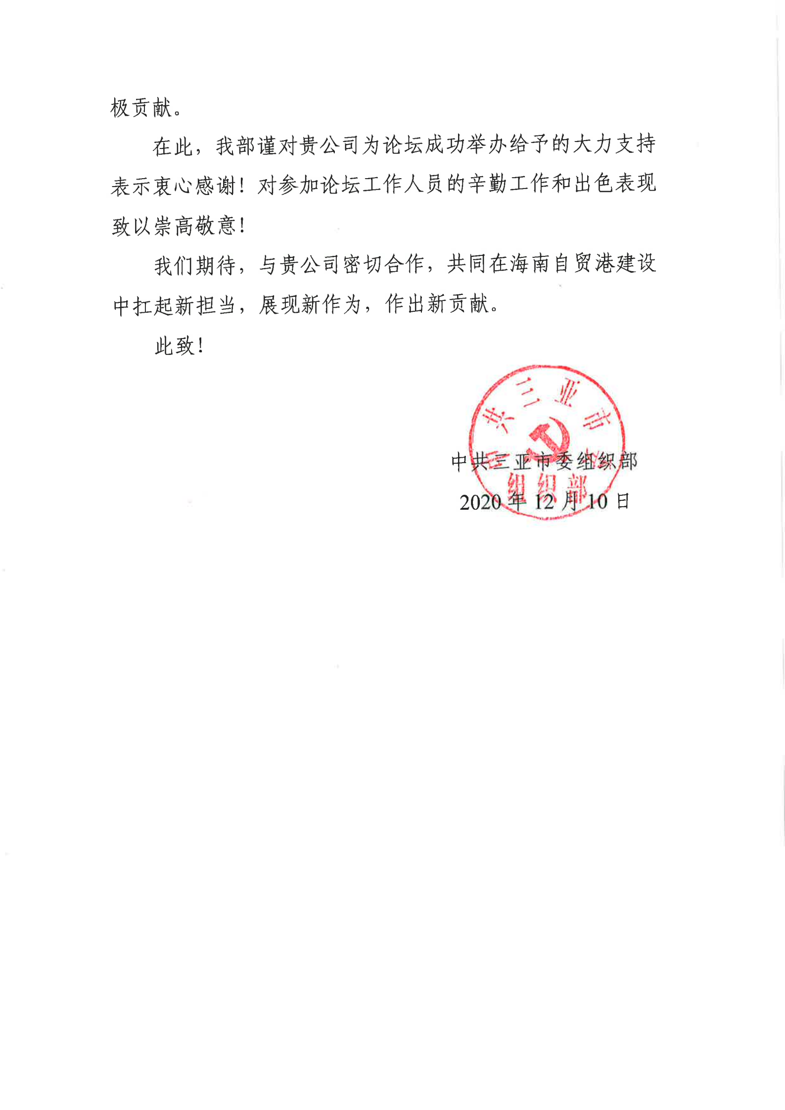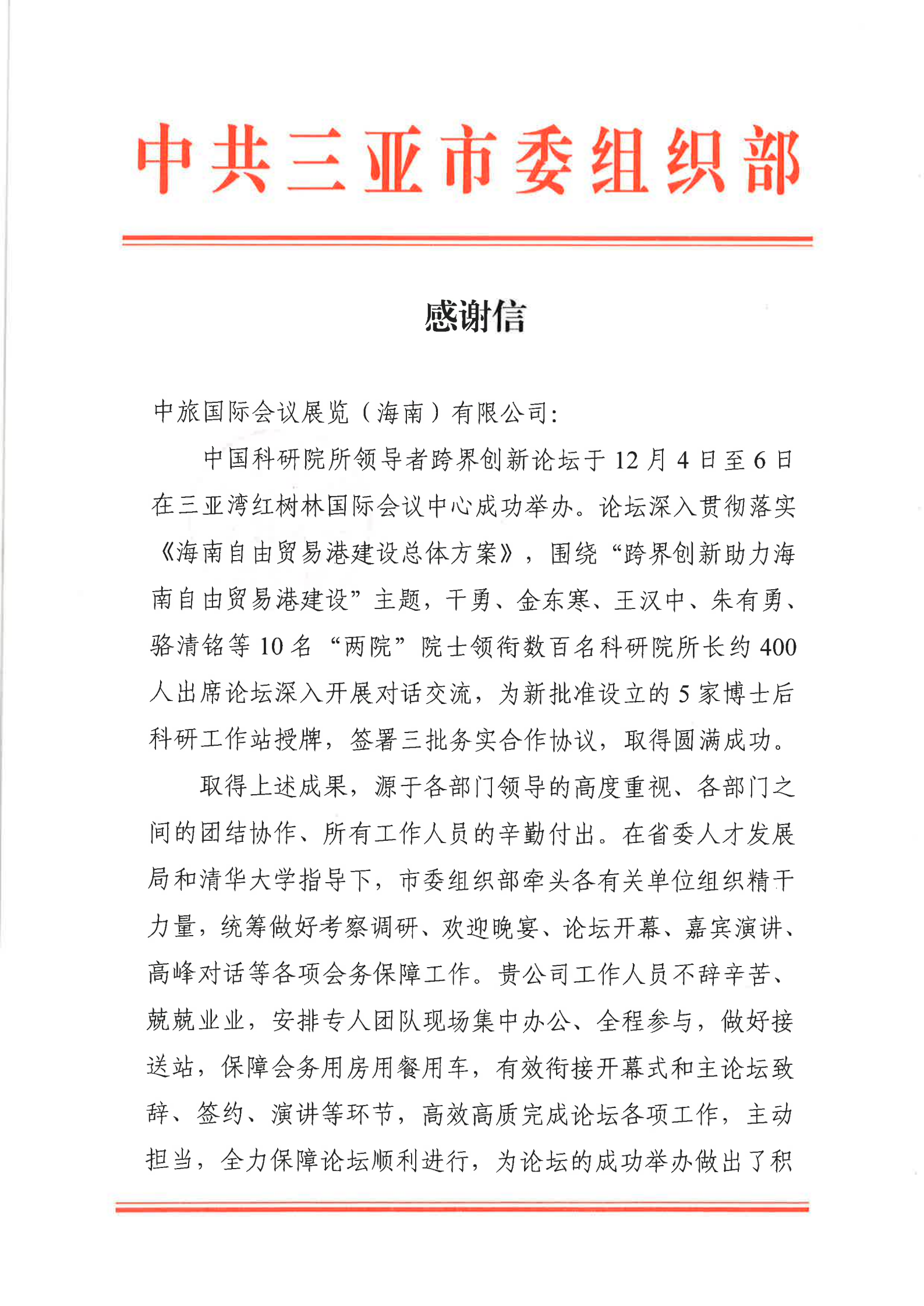 10名“两院”院士领衔数百名科研院所长出席论坛交流科技跨界创新,助力海南自由贸易港建设。中旅会展发挥专业优势全案承接本届论坛,包括考察调研、论坛开幕、嘉宾演讲、高峰对话、欢迎晩宴等各项会务保障工作,优质的服务和专业的大项目管理经验荣获了三亚市委组织部高度认可,三亚市委组织部向我司颁发了感谢信,予以表彰我司在活动中做出的突出贡献,以资鼓励。