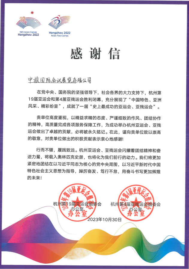 近日,中旅旅行所属中旅会展喜获杭州第19届亚运会组委会及第4届亚残运会组委会联名感谢信。信中对中旅会展精益求精的态度、严谨细致的作风、团结协作的精神及各项服务保障工作的高质量完成表示充分赞许,并对中旅会展团队为杭州亚运会、亚残运会成功举办所做出的卓越贡献与辛勤付出表示衷心感谢。