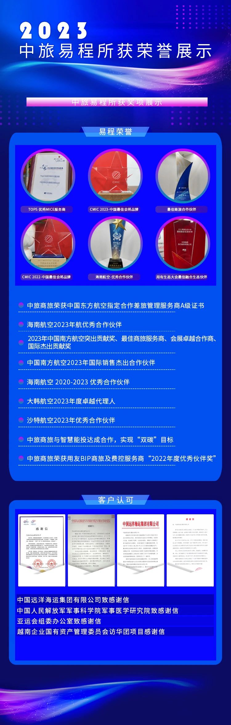 中旅易程旗下商旅品牌依托专业化技术研发团队,全方位推进平台信息化、数字化发展,进一步提升项目运作效能,不仅为中国银行、建设银行、中远海运集团等众多优质客户提供服务,解决其业务实际痛点,更凭借专业实力斩获中国东方航空指定合作差旅管理服务商A级证书、海南航空2023年航优秀合作伙伴等多项荣誉。此外,商旅品牌以中国银行差旅项目为突破口,横向丰富服务产品,从0到1推动差旅业务B向C端延伸,进一步拓宽业务思路与范围,在业务高速发展中进一步增强自身核心竞争力。