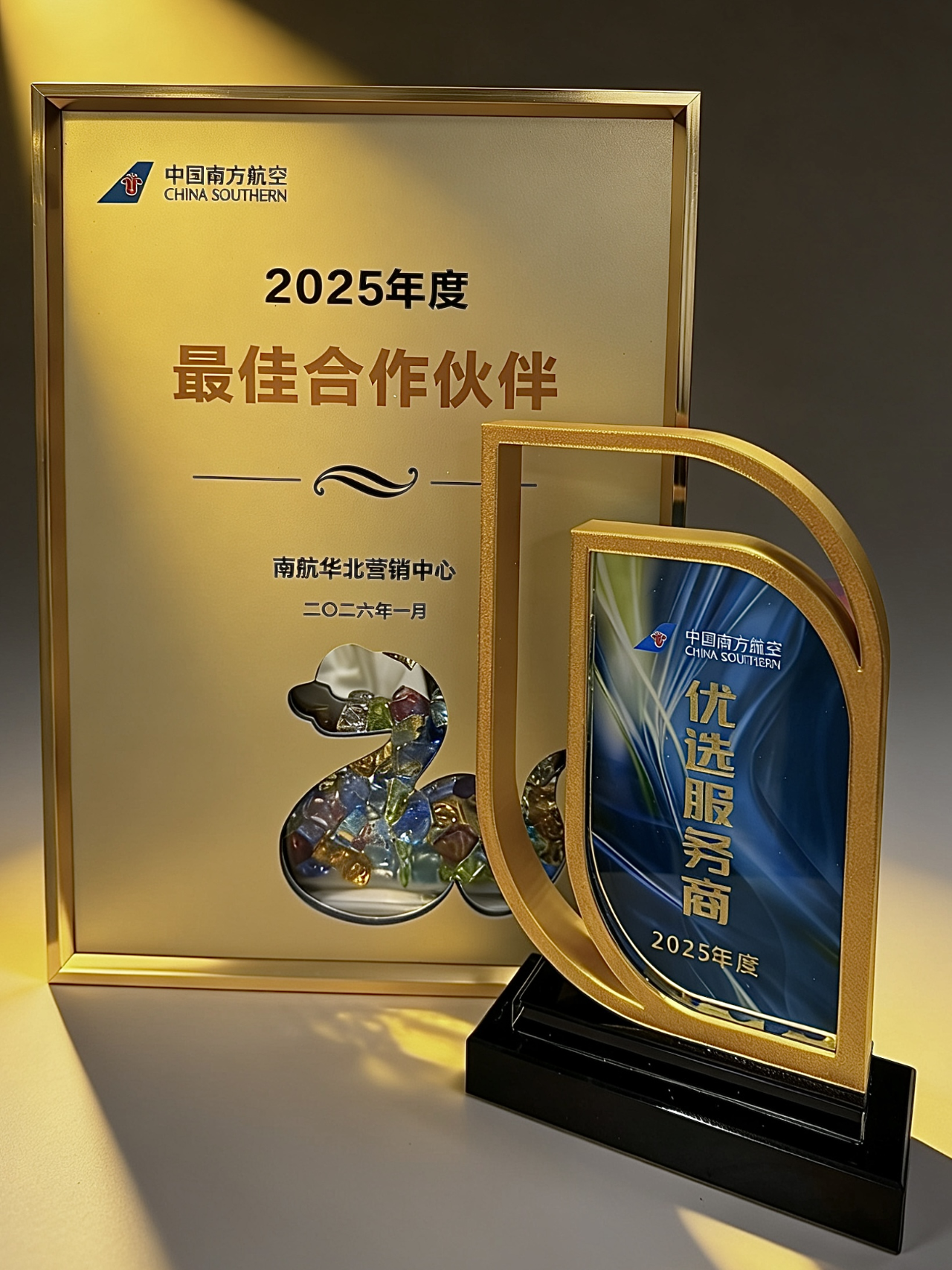 1月28日,南方航空向中旅商旅授予“2025年度最佳合作伙伴”与“2025年度优选服务商”两项重要荣誉。